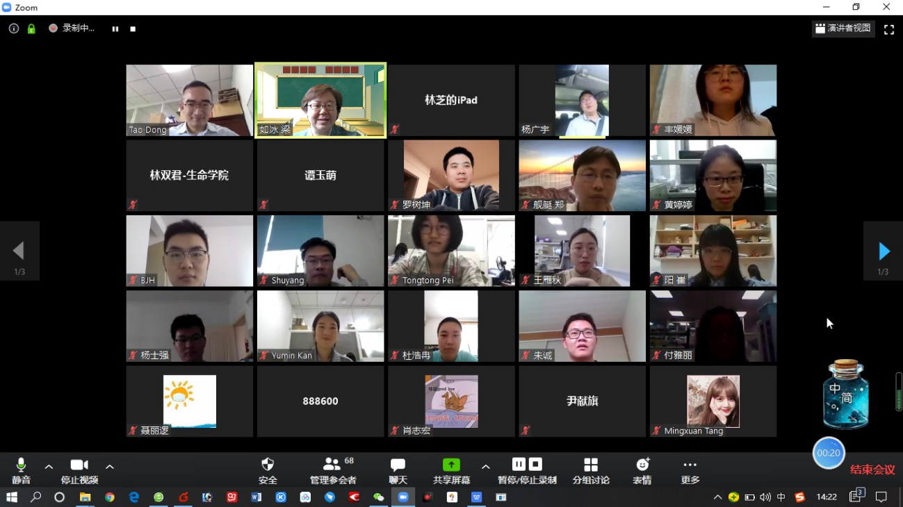 此次在线交流活动立足问题启发、热点讲读与前沿引领,分为微生物代谢与互作、核酸修饰与检测、蛋白功能与进化及结构生物学四大模块进行在线互动交流。从2020年4月22日到5月13日为期一个月,每周举办一次,向学院全体师生开放。依托ZOOM在线平台,来自生物化学与分子生物学系8个课题组的8名研究生先后进行了展示。williamhill官网副院长林双君、生物化学与分子生物学系系主任董涛、副主任梁如冰、支部书记刘昱以及丁伟、黄婷婷、唐满成、吴更、由德林、杨广宇及学院其它系所老师全程参加活动。活动主要由梁如冰主持,每场活动的参会人数均达100人左右,生化系在读研究生全程参会。活动采取学生在线展示与参会人员交流互动相结合的形式进行,每位同学进行二十分钟展示后,导师与参会同学进行二十分钟的提问与交流。每位同学围绕已有工作的进展、问题与展望及拟开展新课题的想法等进行全面陈述,导师依据其学术创新性、数据挖掘度与工作展示度等,给予点评与指导。