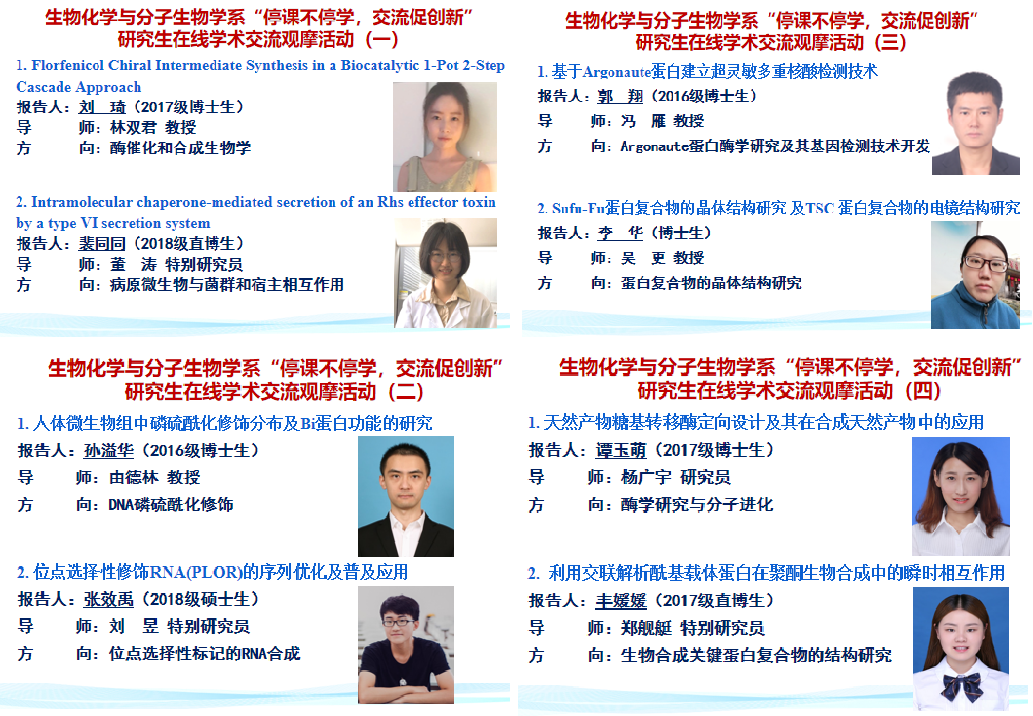 研究生学术交流活动是拓展学术视野、启发学生思路、促进学术创新的重要平台。疫情期间,为了使研究生继续保持活跃的学术交流度,认真思考自身的科研工作,williamhill官网生物化学与分子生物学系在2020年4月-5月期间成功举办了第一轮“停课不停学,交流促创新”的研究生在线学术交流活动。