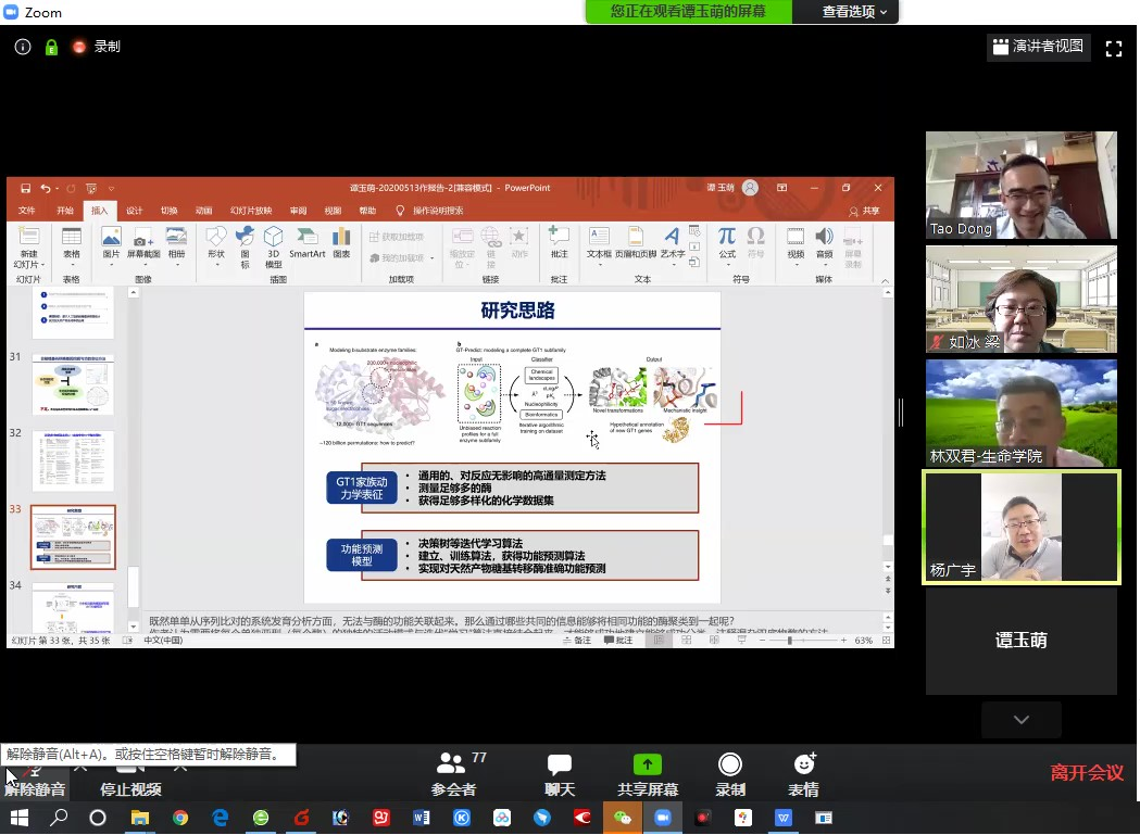 4月22日,首场在线学术交流活动成功举办。首先,董涛为活动致辞。他从开展此次活动的目的、意义和预期效果等多个方面作活动介绍,并希望同学们珍惜这个机会,充分进行自我展示,锻炼个人能力,拓展科研思路。林双君代表学院对此次活动的开展给予了肯定,并提出期望。随后,来自林双君课题组的博士生刘琦和来自董涛课题组的博士生裴同同分别作题为“Florfenicol Chiral Intermediate Synthesis in a Biocatalytic 1-Pot 2-Step Cascade Approach”和题为“Intramolecular chaperone-mediated secretion of an Rhs effector toxin by a type VI secretion system”的工作展示。在随后进行的三次活动中,来自由德林课题组的博士生孙溢华、刘昱课题组的硕士生张效禹、冯雁课题组的博士生郭翔、吴更课题组的博士生李华、杨广宇课题组的博士生谭玉萌和郑舰艇课题组的博士生丰媛媛,先后对自己的科研工作进行了精彩汇报。导师们在肯定他们工作进展的同时,不仅对其研究工作中存在的问题提出了专业性的点评与建议,还对其工作展示的架构与细节等给予了全面的建设性意见。