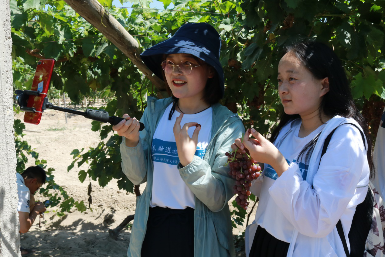 在考察学习的同时,实践团尝试通过电商为当地特产打开一条销路。他们来到金塔县羊井子湾人民政府,和当地干部及创业青年一起参与了金塔青年大讲堂(第二期)暨青年电商就业创业培训活动,来到葡萄种植基地进行实地考察并与当地乡长及果农开展实地交流,亲自主持直播,推销当地的特色农产品葡萄及其他农产品,让更多人了解了当地特产。