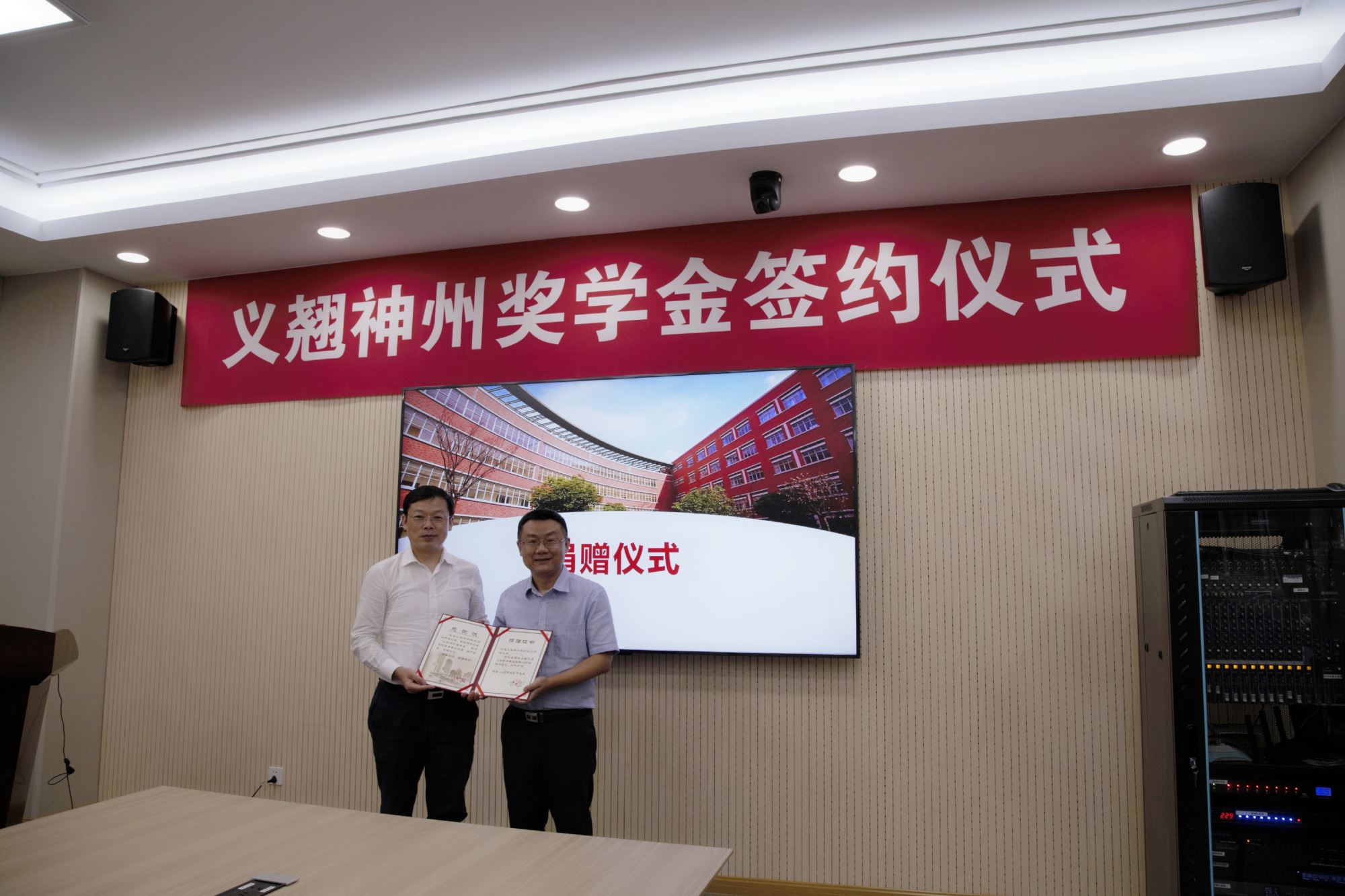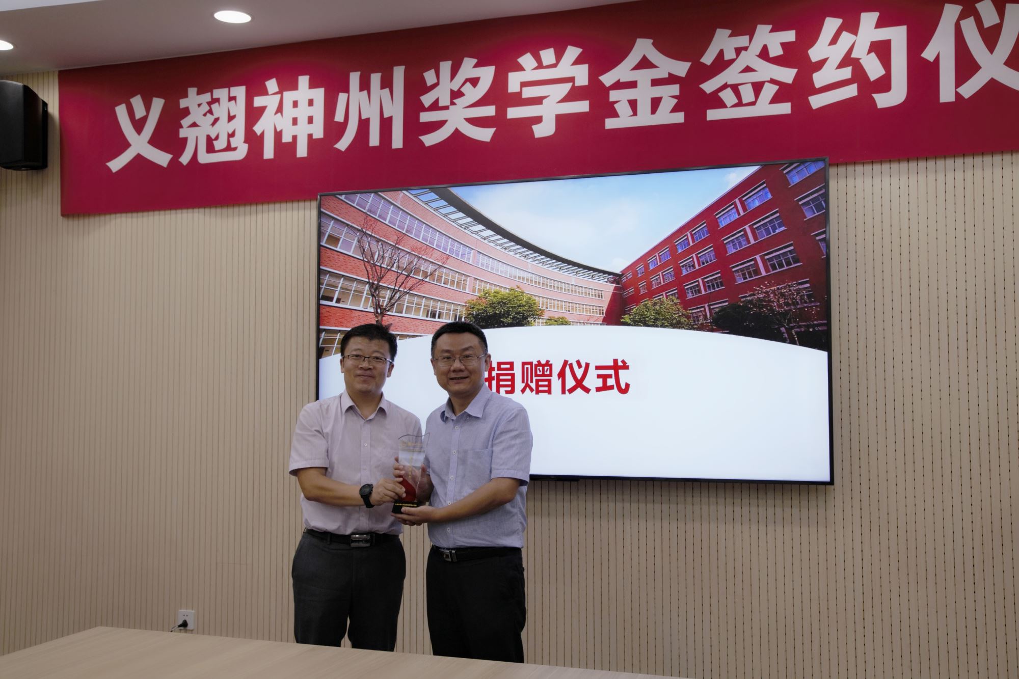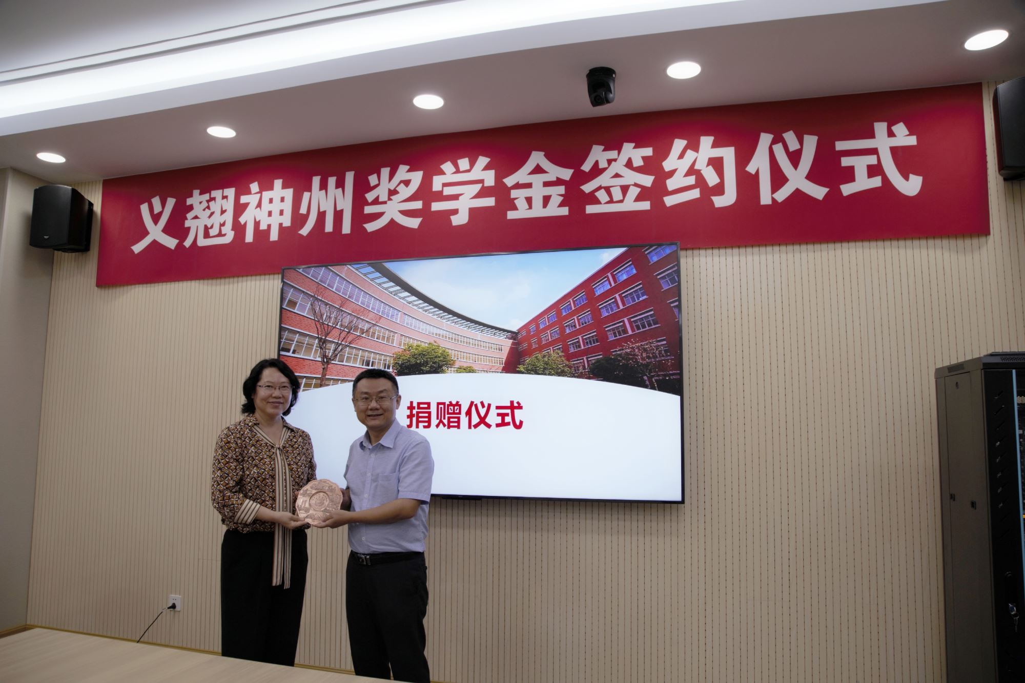 捐赠仪式上,程骄杰、嵇绍岭、冯雁代表williamhill官网向捐赠方北京义翘神州科技股份有限公司颁发了捐赠证书、义翘神州奖学金水晶杯及校景铜盘,感谢捐赠方对教育事业的支持。