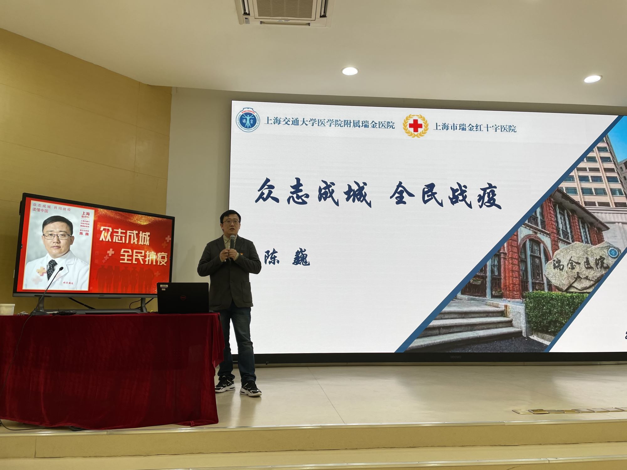 陈巍医生以“众志成城、全民抗疫”为主题向同学们开展了专题讲座。陈医生首先介绍了新冠肺炎病毒的传播机制、检测方法与治疗手段,而后从“出征、防护、创新、坚守、点燃、复苏、感恩”等不同视角切入,以生动鲜活的事例向与会师生还原了瑞金医院援鄂医疗队在抗疫一线的战斗历程。陈医生真切讲述了一线的医务工作者在面对新冠病毒时临阵不惧,坚守奋战,克服重重困难,以实际行动诠释“疫情就是命令,防控就是责任”的感人事迹,并在谈起艰苦工作历程时举重若轻,提到自己和另外一位重症医学科的主任医师轮班上阵,只为“万一一个倒了,另一个还能继续领导工作” 时引发了全场热烈的掌声。同样令陈医生印象深刻的是在抗疫过程中,医疗队成员彼此相互鼓励,并为患者带来了精神抚慰,用乐观的态度驱散了疫情的阴霾。在“创新”这一主题中,陈医生提到他所在援鄂医疗队救治与创新并举,在疫情救治期间共取得了38项医工交叉创新成果,申请了6项发明专利。最后他欣慰地说,疫情期间医疗队成员严抓院感防控工作,医务人员无一感染,同时还开展了医学生线上教育,将战疫精神薪火相传……白衣为甲奋战抗疫一线,赤子丹心力保国泰民安——瑞金医院援鄂医疗队与其他无数奋战抗疫的英雄一起,唤醒了沉睡的江城。